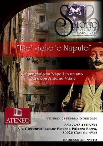 Ancora Teatro in pompa magna questo mese, perché il salotto chiude il calendario di febbraio con un attore professionista, Antonio Vitale, che in scena presso il teatro Ateneo di Casoria darà prova attoriale in doppia veste. Antonio è autore e interprete di un monologo che avrà il privilegio di portare gli spettatori p’è vic è Napule.
