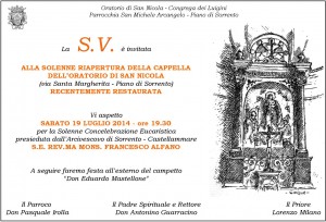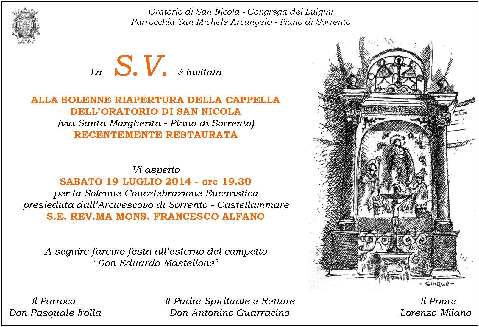 Nel lontanissimo maggio del 1334, per volere di un nobile sacerdote (don Parisio Massa), fu posta sul Luogo di Carotto, una cappella intitolata alla Vergine e ai Santi Nicola e Antonino, patroni del mare e dei marittimi, visto che dal porto di Cassano, proprio lungo via Gottola e Santa Margherita, i prodotti dal mare venivano venduti nella Gran Piazza del Mercato, l’attuale Piazza Cota. Tra alterne vicende, e dopo i vincoli imposti dalle leggi sulle guarentigie post Unità d’Italia, che le imposero anche la chiusura, a vita nuova con l’istituzione del pio sodalizio della OCngregazione dei Luigini (1875). Uno di quei confratelli, Don eduardo Mastellone, negli anni ’20 del secolo scorso provvide all’allargamento della Cappella e alla costruzione di un ampio salone e di un campo giochi all’aperto: nacque l’Oratorio. Cuore della gioventù di centinaia di cittadini carottesi. La cappella aveva bisogno di inevitabili lavori di recupero, sia all’interno che all’esterno. Reintegrazione dell’intonaco della volta della campata centrale, le cornici sono state consolidate nei tratti dove si presentavano distaccate dalla struttura muraria: rifacimento del basamento in muratura, con effetto finto marmo. Posato una nuova pavimentazione in cotto nella parte centrale della cappella. Tinteggiatura delle pareti con colori scelti dopo un apposito studio effettuato in sede e relative prove sul posto. Si tratta di un giallo chiaro e di un blu più chiaro rispetto al precedente, Una striscia color marrone ha sostituito quella precedente, di un viola acceso. Uno degli interventi più interessanti ha riguardato, entrando e volgendo lo sguardo in alto a destra, un nuovo punto luce, sicuramente antecedente al lucernaio ricostruito in seguito all’allargamento della cappella a inizio novecento, e che è stato restituito per intero alla cappella. Gli interventi hanno riguardato inoltre la facciata con una ritinteggiatura che ha reso protagonisti colori più tenui, e il portone d’ingresso, riportato all’originario legno naturale. Da un paio di settimane, infine, gran da fare anche all’interno dell’attuale sagrestia e dei locali per la pastorale. Insomma un restyling in pieno stile, dopo oltre un quindicennio dall’ultima ritinteggiatura dei saloni, e otto anni dalla messa a nuovo del campetto sportivo. L’appuntamento, dunque, sarà per tutti – ma proprio tutti – il prossimo 19 luglio (ore 19.30). Si farà un sacrificio anche per il caldo, consapevoli che l’estate è scoppiata davvero, e saranno in tanti ad affollare la chiesetta. Alla presenza di S.E. Mons. Alfano, Arcivescovo della Diocesi Sorrento – Castellammare, sarà proprio l’eucarestia celebrata nella rinata cappella a dare un senso a quanto fatto in questi quasi due anni di lavoro. Saranno presenti le autorità civili della Città di Piano di Sorrento, i rappresentanti della Sovraintendenza ai Beni Artistici che hanno seguito passo passo, l’evolversi dei singoli interventi. Sarà presente l’Architetto Franco Ruocco, che ha gestito e coordinato i lavori. E ovviamente il Parroco, Don Pasquale, ma anche e soprattutto Don Antonino Guarracino, 95 anni, sicuramente l’anima dell’Oratorio di San Nicola.