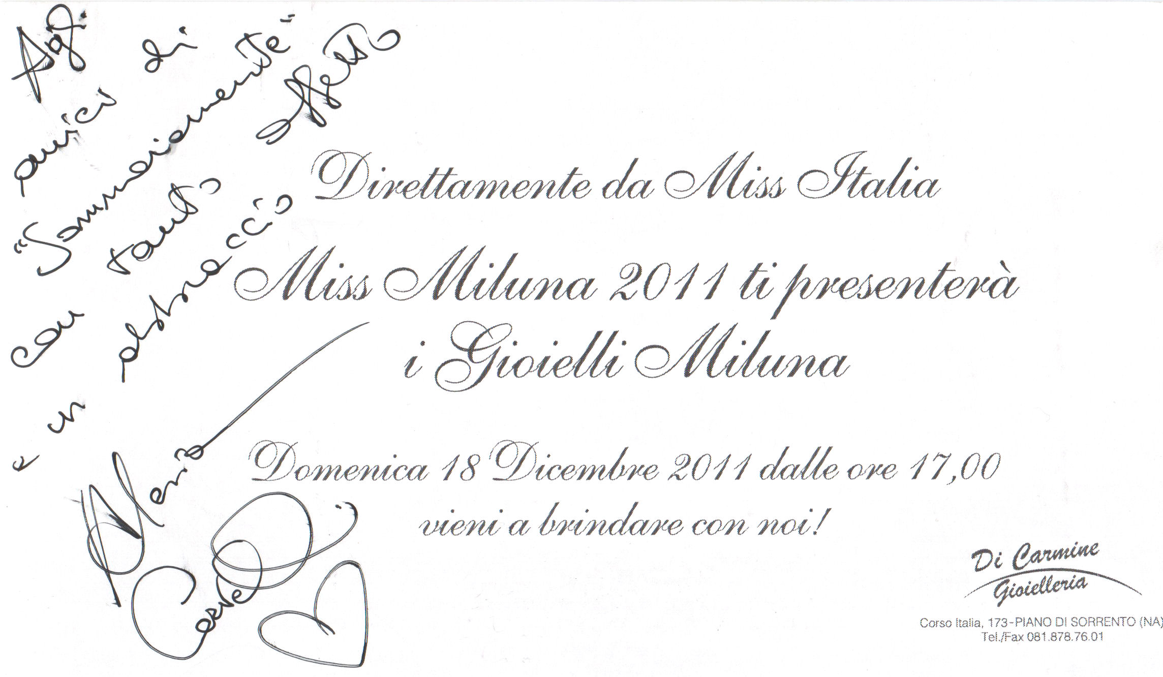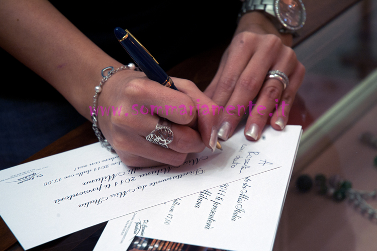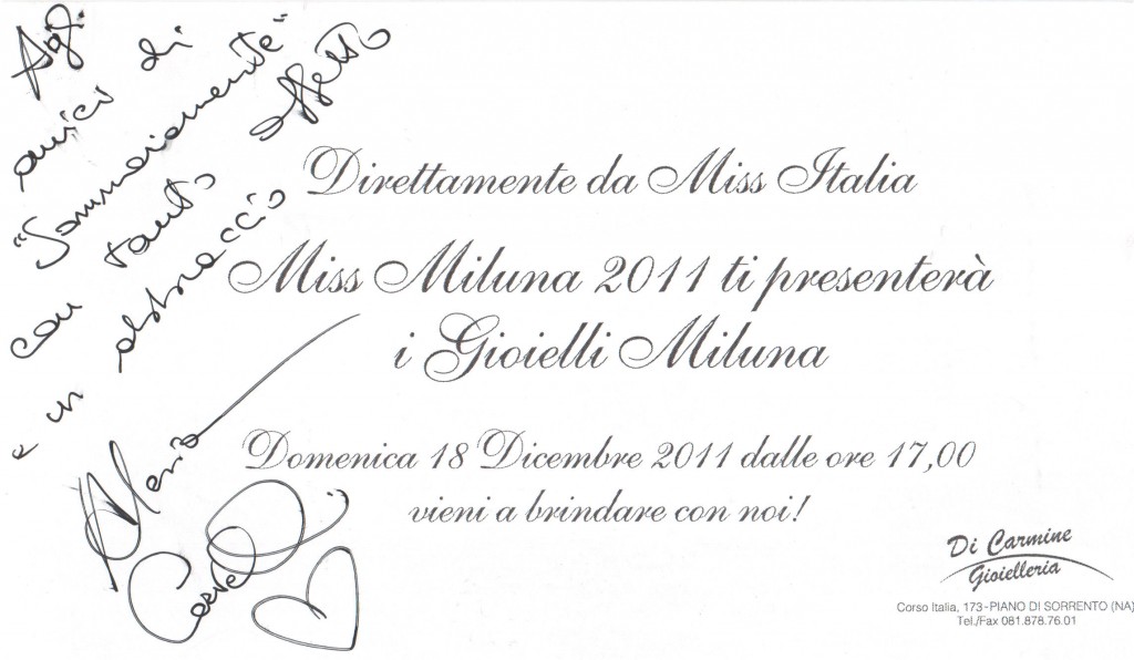 Accompagnata da Tony Massa a bordo della nuova AUDI Q3 gentilmente concessa per l’occasione da A&C MOTORS di Torre Annunziata, è giunta a Piano di Sorrento, Miss Miluna 2011 nella persona di Alessia Cervelli 20 anni compiuti da un mese, nata a Moncalieri, vive a Torino. Ha partecipato a Miss Italia per la prima volta, ma era il suo sogno fin da piccola, è figlia unica e per sua fortuna” oserei dire” non tifa o parteggia per nessuna squadra di calcio e non pratica sport (e qui una punta d’invidia da parte delle ragazze presenti nella gioielleria si sente). Aspira a diventare conduttrice televisiva ed è appassionata di fotografia, ma il sogno nel cassetto è diventare un’affermata stilista di moda, ma nel contempo studia scienze politiche. Ha un viso angelico acqua e sapone da classica ragazza della porta accanto. Conquista una delle fasce più prestigiose e per una manciata di voti non vince Miss Italia. Sergio Cielo patron di Cielo Venezia1270, a cui fa capo il brand Miluna, da 15 anni sponsor indiscusso di Miss Italia, afferma di essere stato folgorato dalla spontaneità della ragazza, dichiarando: “Per valutare l’armonia della natura occorre mettersi nella condizione di riconoscerla, per questo la nostra miss deve avere un viso angelico, da bambina ed Alessia ha gli esatti requisiti, un filo di trucco e niente interventi estetici“. Spero per lei ha aggiunto il patron che Miluna sia per Alessia un autentico trampolino di lancio per una sfolgorante carriera, come lo è stato in passato per altrettante miss. Alessia è arrivata tra le prime dieci durante la serata finale e che